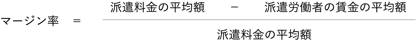 マージン率は、派遣料金から派遣労働者の賃金を除いた金額の割合を示したもので、以下の計算式で算出されます。